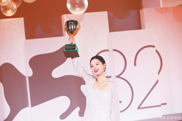 辛芷蕾手握威尼斯电影节最佳女演员奖杯。