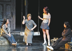 北京人艺话剧《小郡之秋》剧照,龚丽君饰演的母亲(左二)与陈小艺(右一)、张培(左一)、原雨(右二)饰演的三个女儿在一起。北京日报记者 方非摄