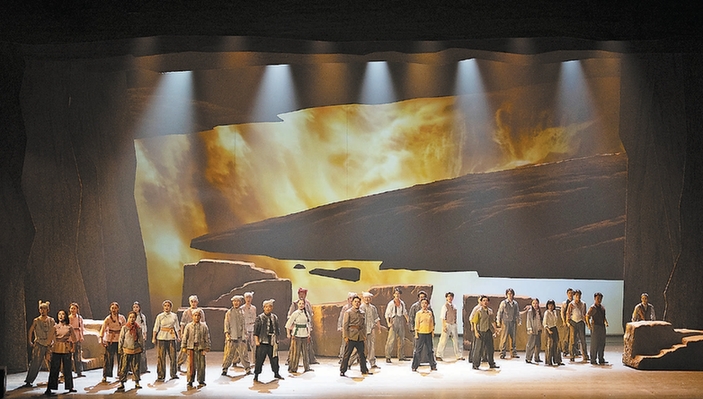 《高歌》在唱腔上做了多元融合。拥有一副天然好嗓子的当地姑娘兰兰,一亮相就用豪迈嘹亮的歌声征服了全场。饰演兰兰的袁东方,其实是流行唱法出身。“我是南方人,演绎一个说陕北话、唱原生态的陕北女孩,确实很有挑战。”为此,袁东方反复调整唱腔、找发音位置,还专门学习舞蹈。剧中,美声、民族、流行、原生态等多种音乐元素交织融合,首演后被观众称赞“含歌量超高”。“很惊喜这部剧能将民歌和摇滚融合得这么好,也帮助我们了解陕北民歌。”一位观众说。