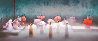 剧中人物的衣着形象如中国古画中的工笔白描,多媒体影像则近似水墨画,以《牡丹亭》原著中“雨丝风片”一词的韵味为旨,神似赵无极的泼墨,又像是莫奈晚年所绘睡莲的放大模糊版,如梦如幻,如露如电。这种高度意象化的画面和巨大画幅,在舞台上传递出一种只可意会的美感,让人联想到烟雨蒙蒙的江南春日。而高频出现的烟雾,则以不同形态在舞台上奔涌,有时如云瀑仙山,有时如轻雾缭绕,有时又像是淡彩浓墨溶入水中,万千变化,妙不可言。