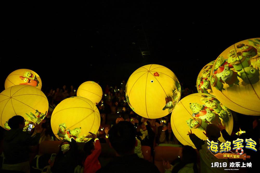 活动现场,布置充满海绵宝宝元素,巨型打卡墙与角色跳舞屏吸引观众纷纷合影,成为热门互动点。特别打造的沉浸式观影体验中,乐队现场演绎经典主题曲引发全场跟唱,映后荧光气球与手环环节更是将气氛推向高潮,观众在温暖光海中感受纯粹快乐。