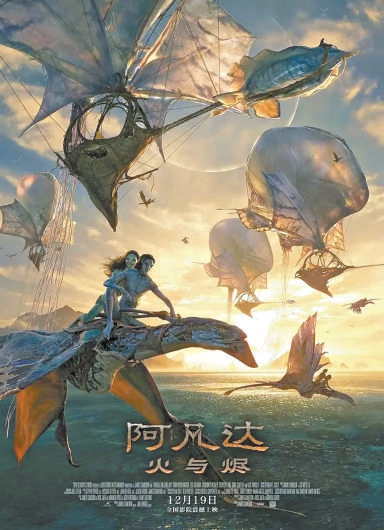 飞艇是目前正在上映的阿凡达系列第三部《阿凡达:火与烬》中率先出现的奇观:它就像天空中翱翔的庞大僧帽水母,搭载货物,在不同的族群间往来做生意。飞艇半透明的形态充满了海洋生物的轻盈与神秘感,此时,天空中的风有了透明的形状,画面美到令人窒息。好景不长,“风之商人”在途中遭遇“灰烬族”的袭击和抢掠,燃火的箭矢嗖嗖飞来,飞艇熊熊燃烧,杰克一家也卷入了战火中。