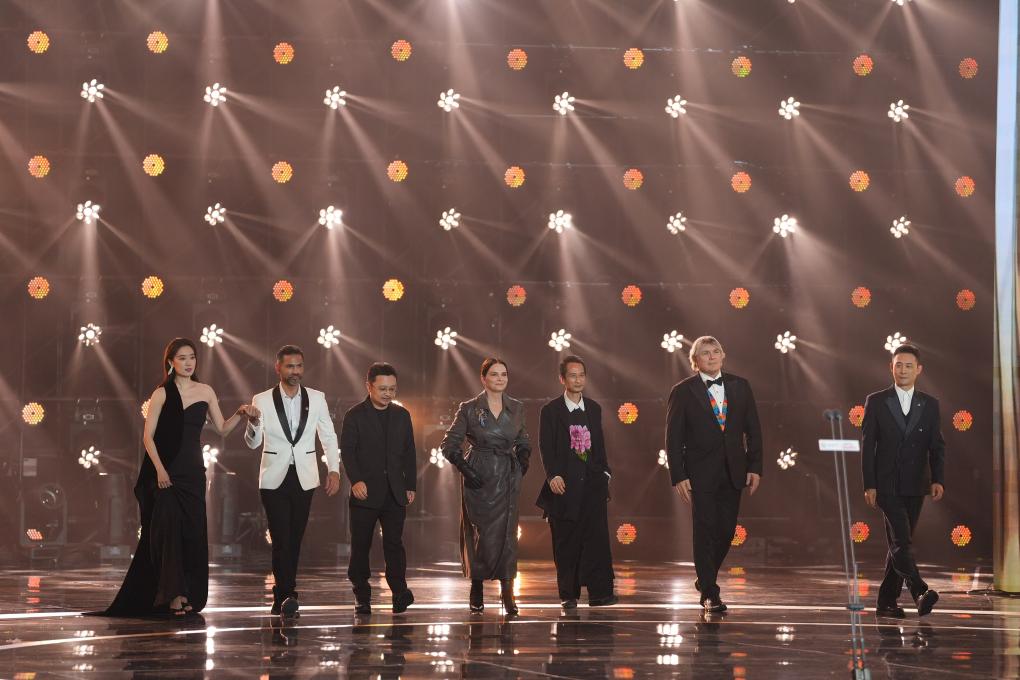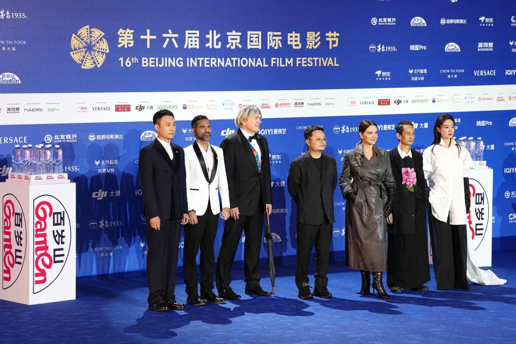 4月16日,第十六届北京国际电影节“天坛奖”国际评委会主席朱丽叶·比诺什(左四)和评委毕赣(左三)、陈英雄(右三)、加布里埃尔·马斯卡罗(左二)、西蒙·弗兰格林(右二)、张小斐(左一)、张译(右一)在开幕式上。新华社记者 谢晗 摄