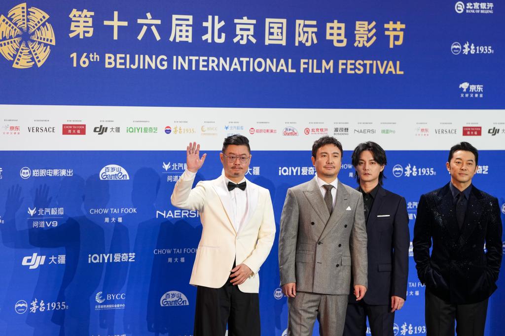 4月16日,电影《年会不能停2》导演董润年(右一)、制片人应萝佳(左一)和演员白客(右二)、张若昀(左二)亮相开幕红毯。新华社记者鞠焕宗 摄