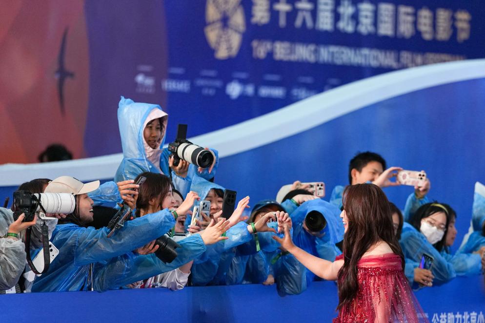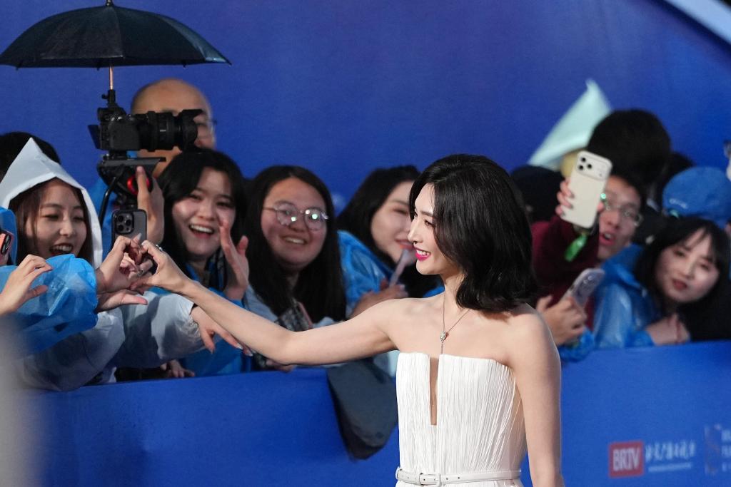 4月16日,演员江疏影在开幕红毯上与影迷互动。新华社记者鞠焕宗 摄